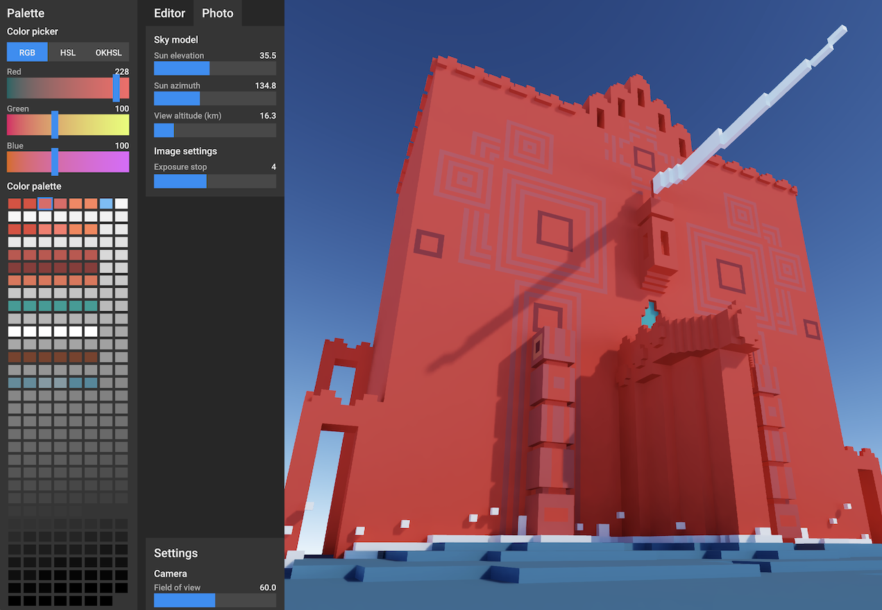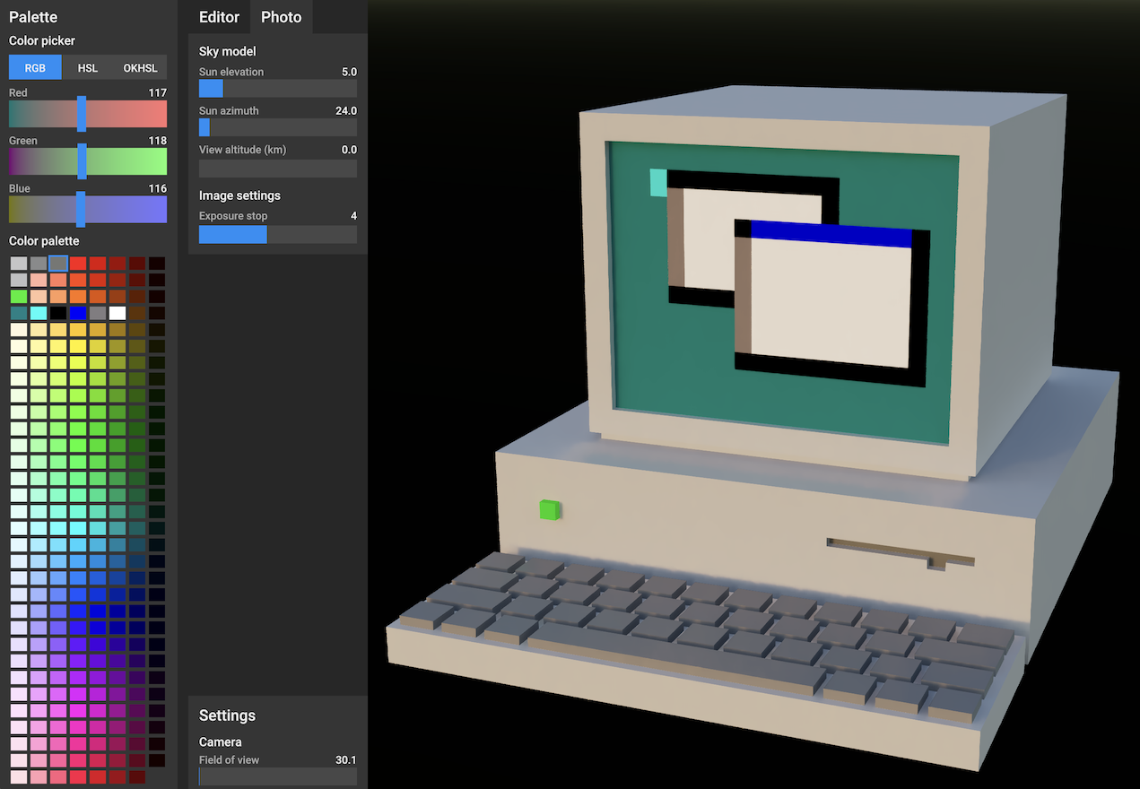 Polycube is a voxel editor for easy 3D modeling and previewing. Create models on a simple grid and export them to MagicaVoxel format for use in other tools and games.